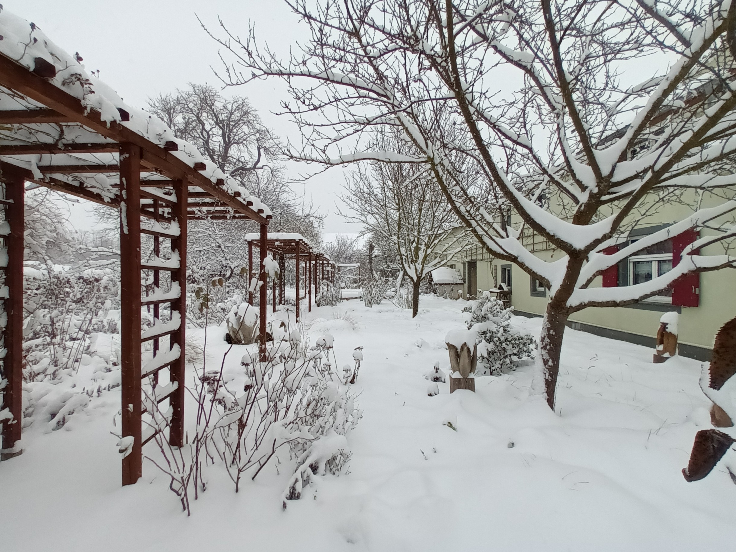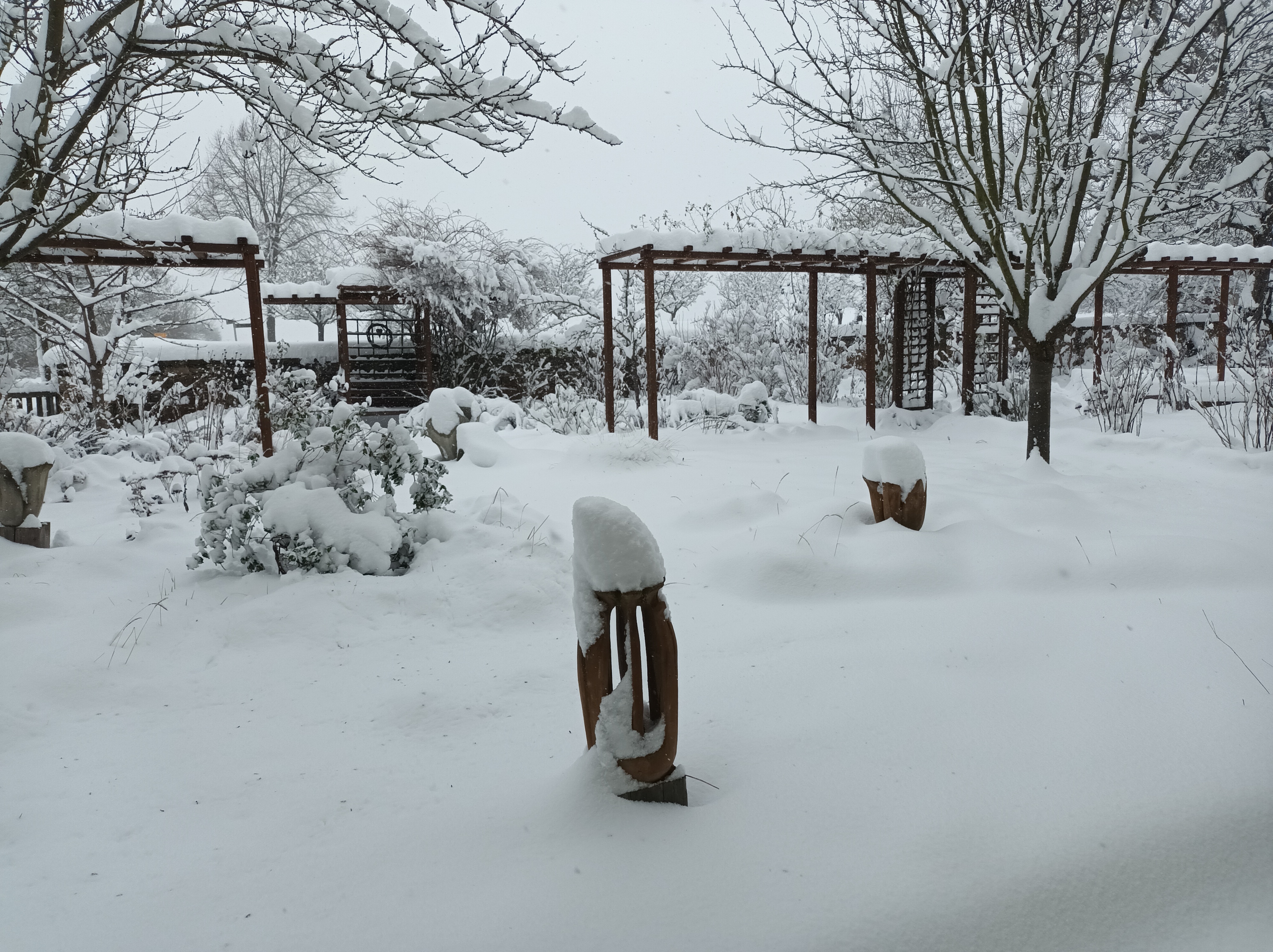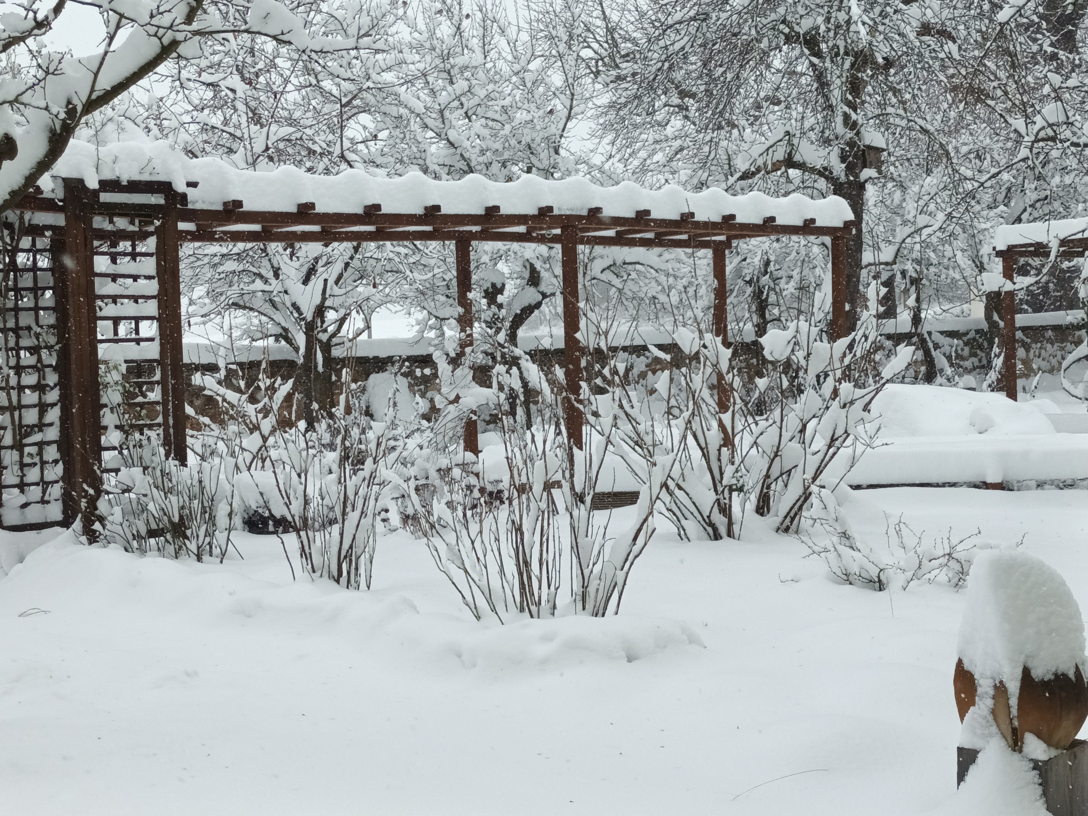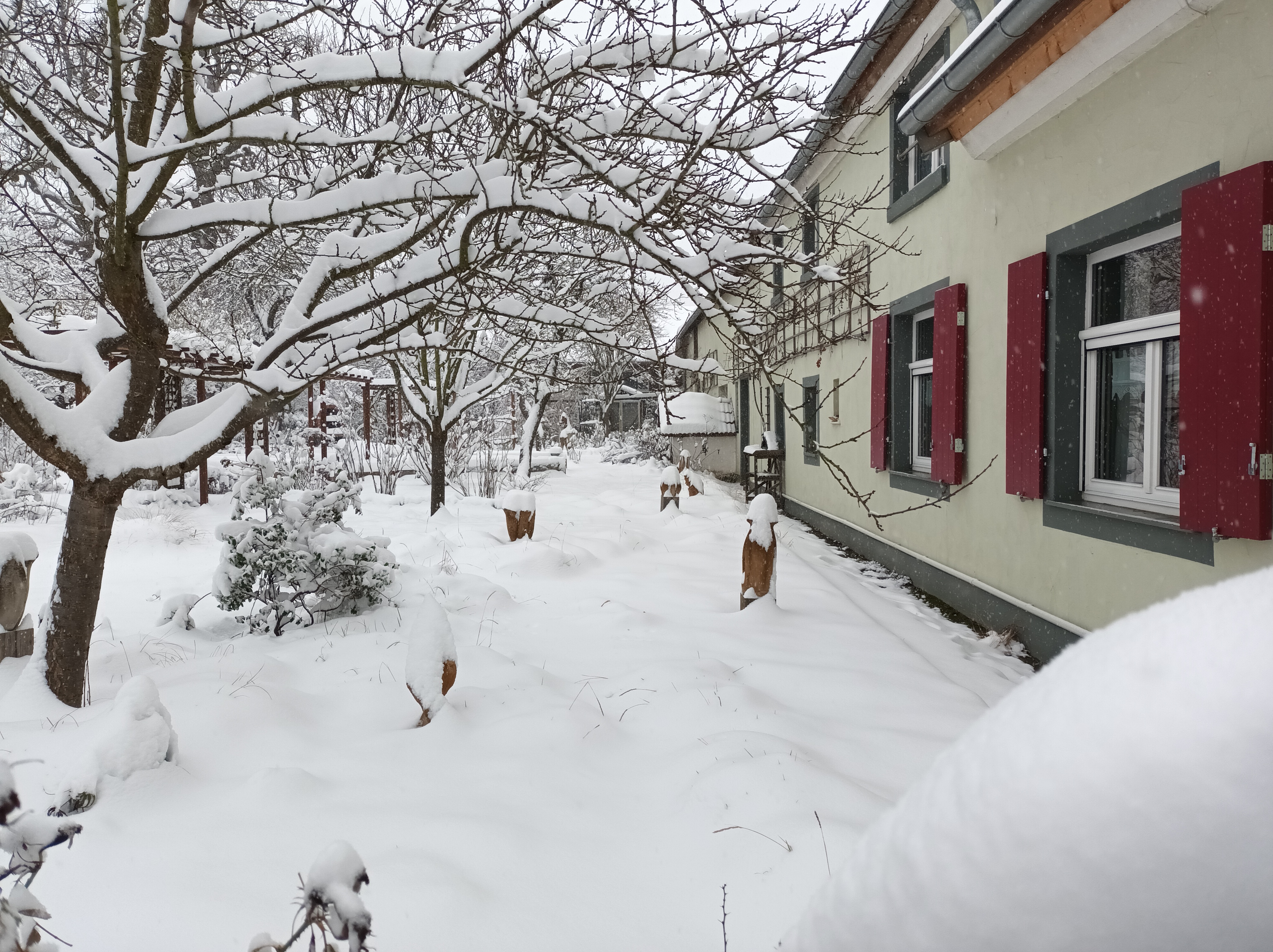Der Winter 2010/11 war unser ersten Winter in unserem Haus in Unterfranken. Dieser und der folgende Winter brachte reichlich Schnee, wie im Sauerland. Seitdem waren die Schneetage selten und der Schnee war schnell geschmolzen. Diesen Winter überraschte uns ein ausgiebiger Schneefall, der nachts begann und den ganzen folgenden Tag anhielt. Die Wege mußten mehrmals geräumt werden. Im Garten lagen 30 bis 40 cm Schnee und deckte die frischen Austriebe zu.