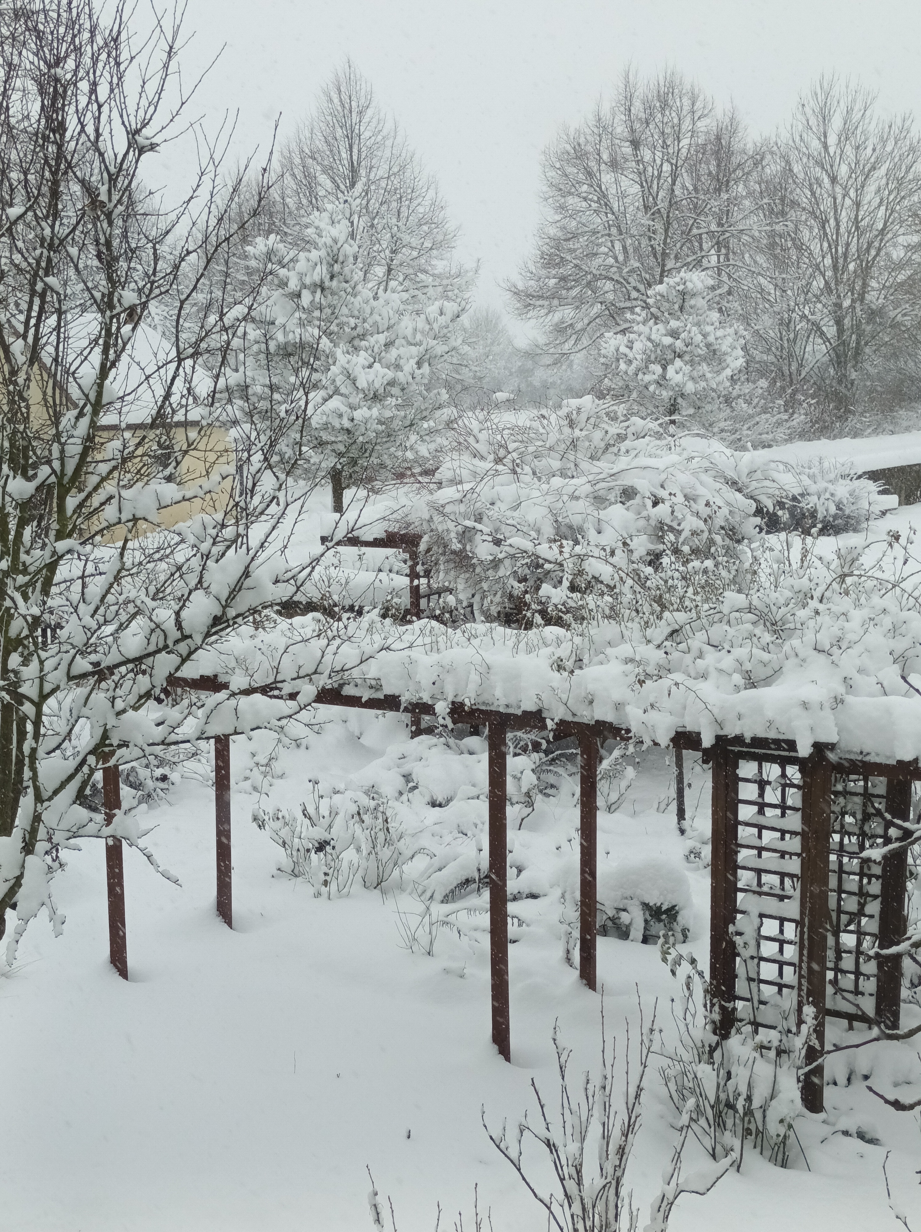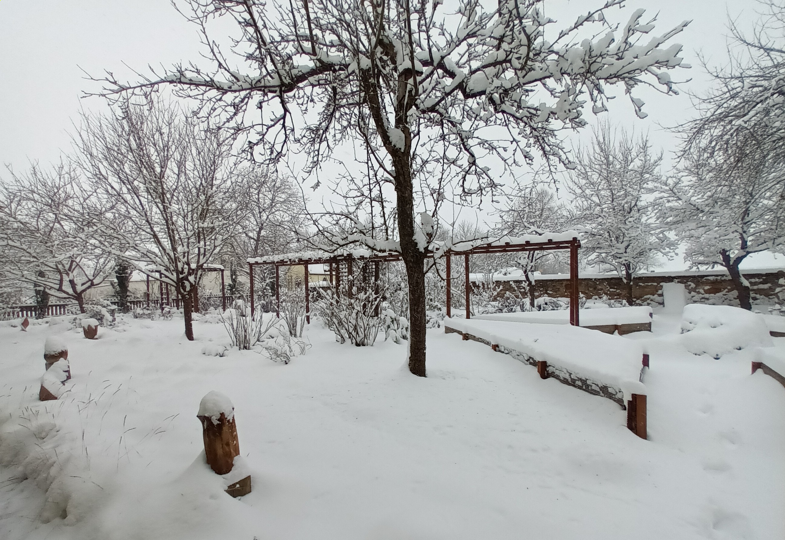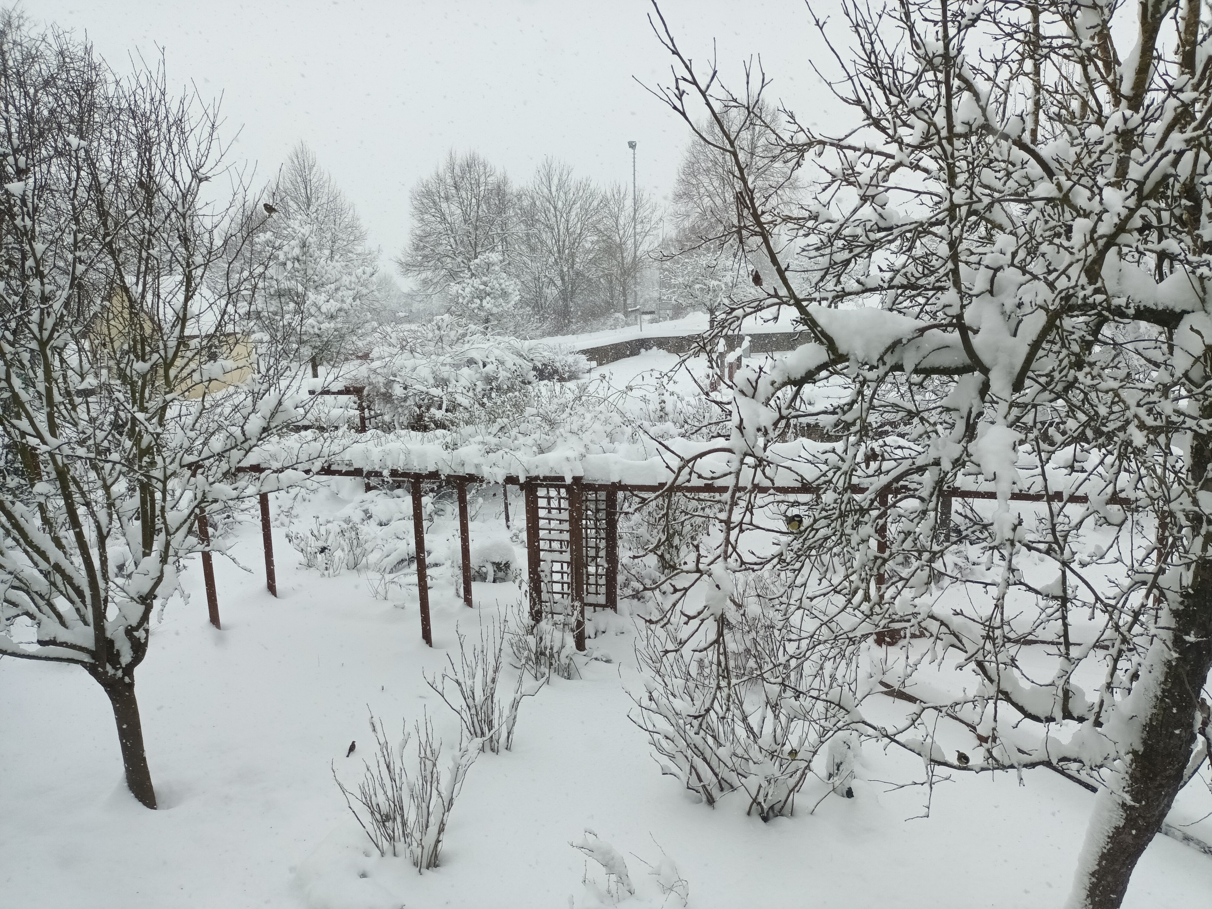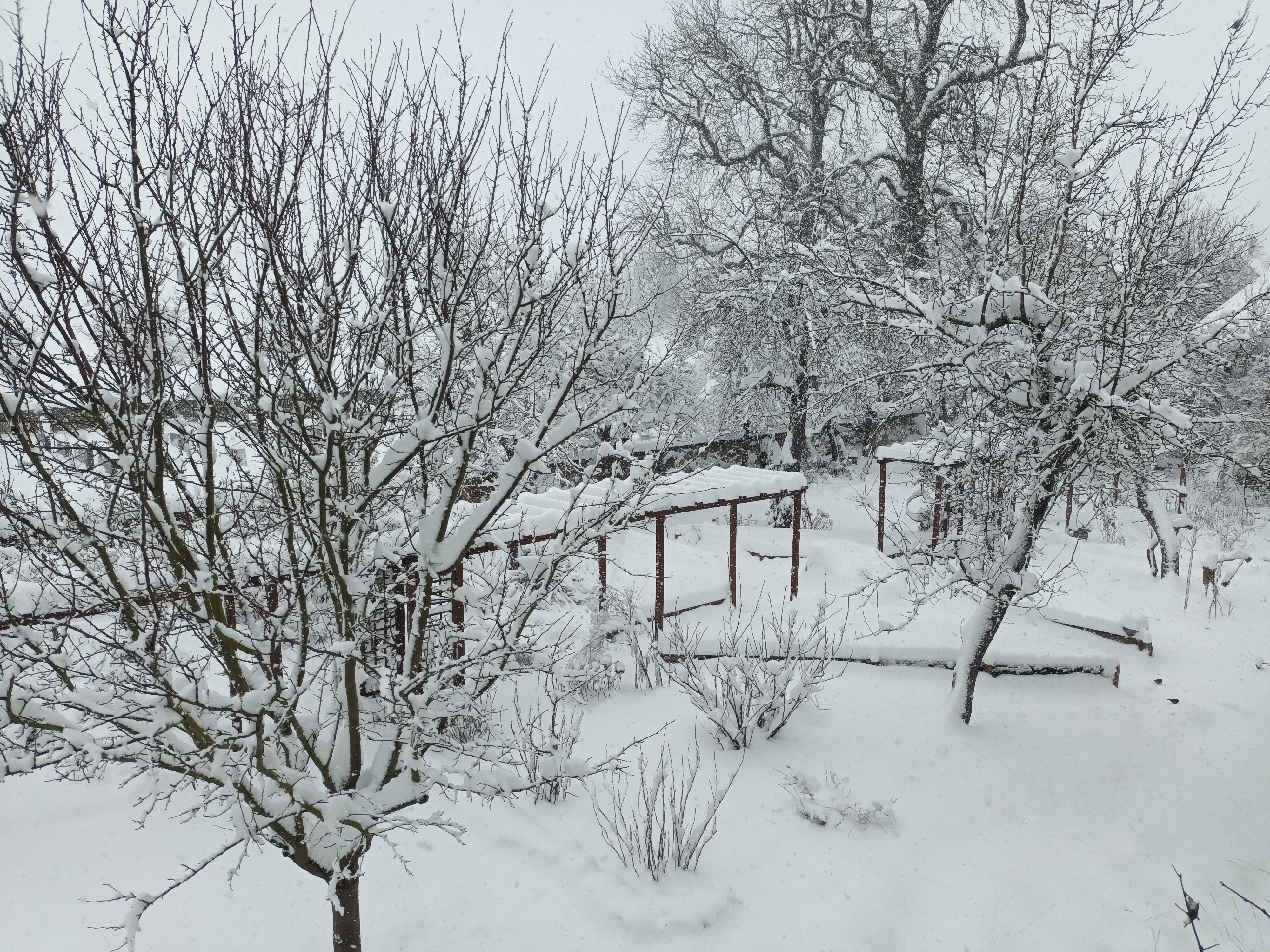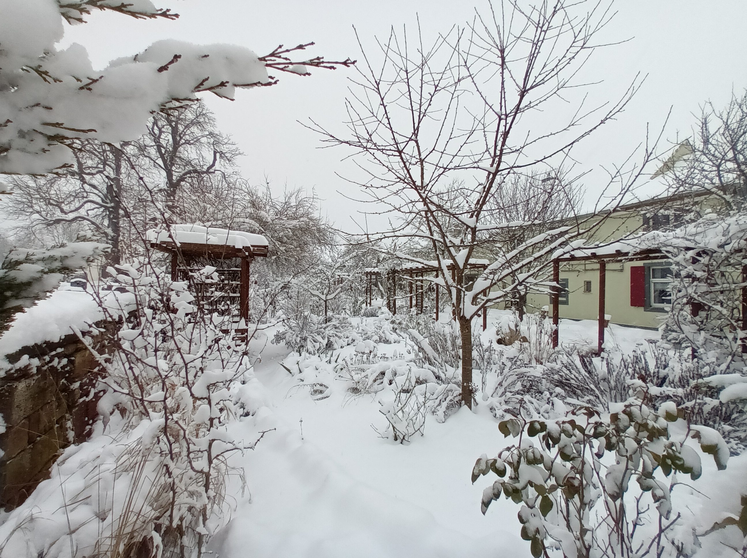 Der Winter 2010/11 war unser ersten Winter in unserem Haus in Unterfranken. Dieser und der folgende Winter brachte reichlich Schnee, wie im Sauerland. Seitdem waren die Schneetage selten und der Schnee war schnell geschmolzen. Diesen Winter überraschte uns ein ausgiebiger Schneefall, der nachts begann und den ganzen folgenden Tag anhielt. Die Wege mußten mehrmals geräumt werden. Im Garten lagen 30 bis 40 cm Schnee und deckte die frischen Austriebe zu.