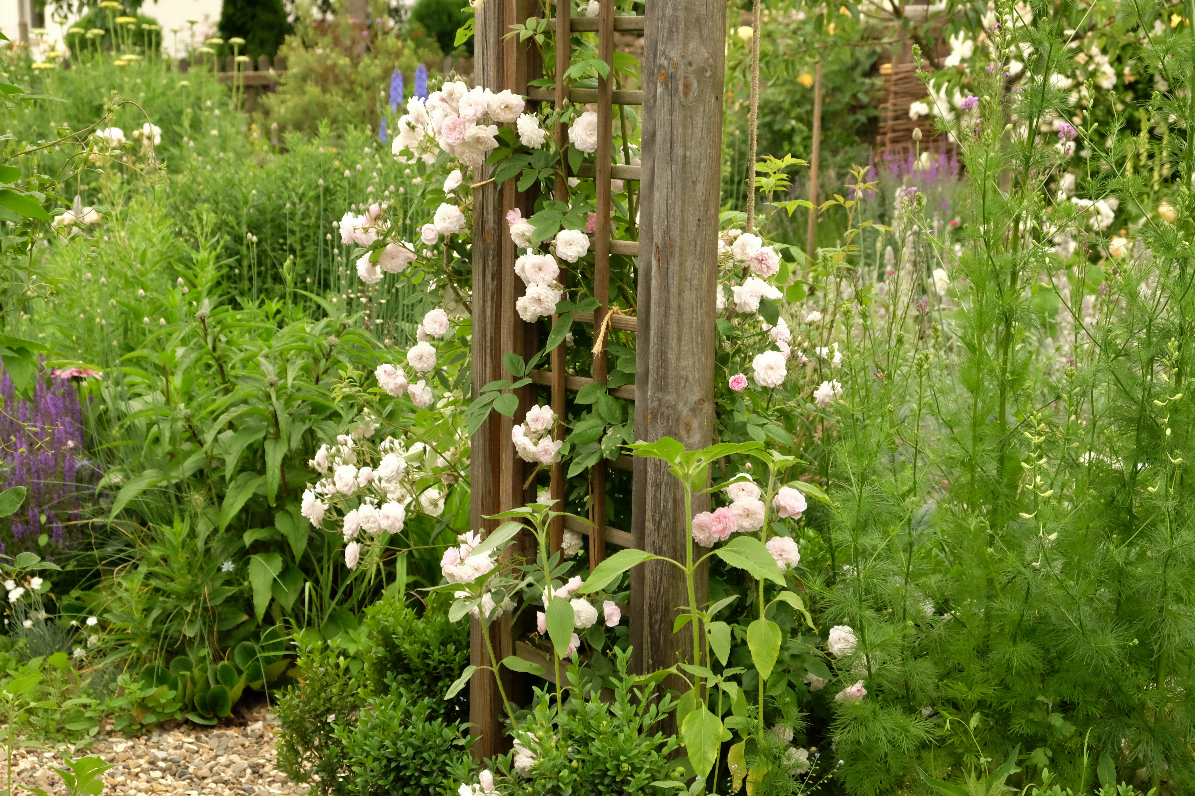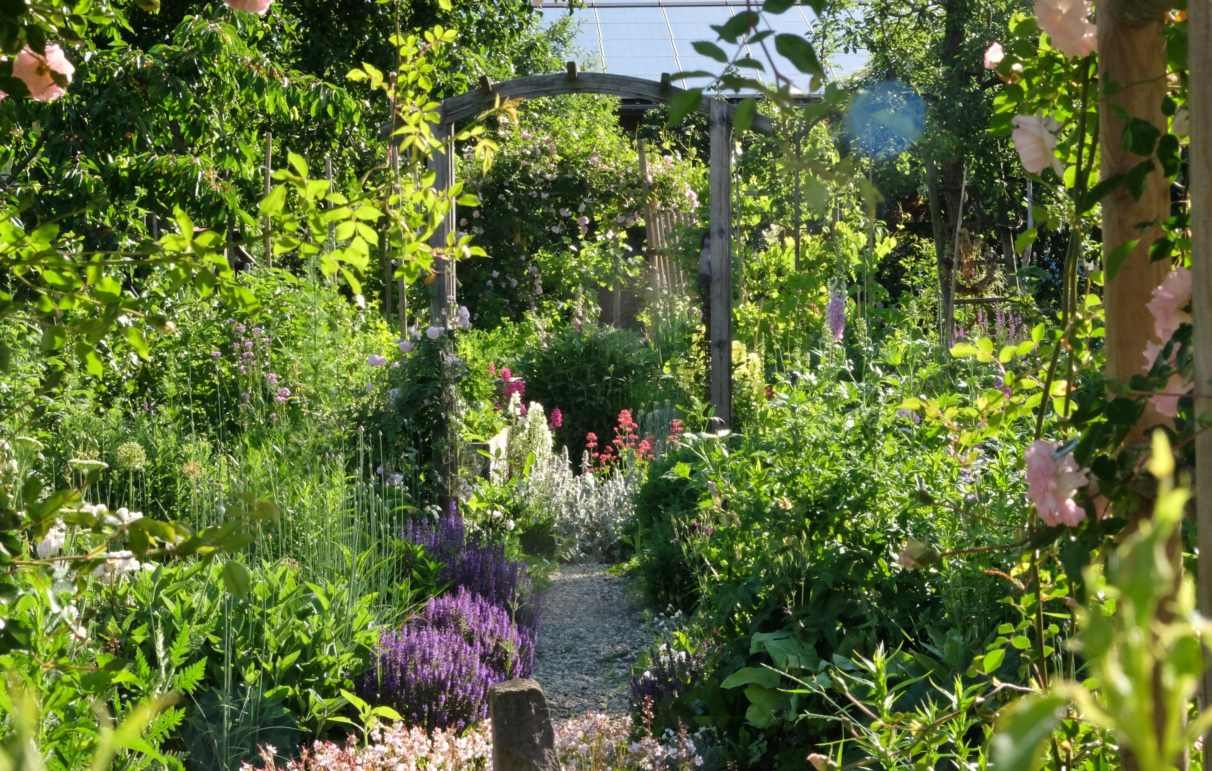 Die verschiedenen Gartenräume betritt man durch Rosenbogen, an denen einmalblühende kleinere Rambler wachsen: Francois Juranville, May Queen, Lauré Davouste.