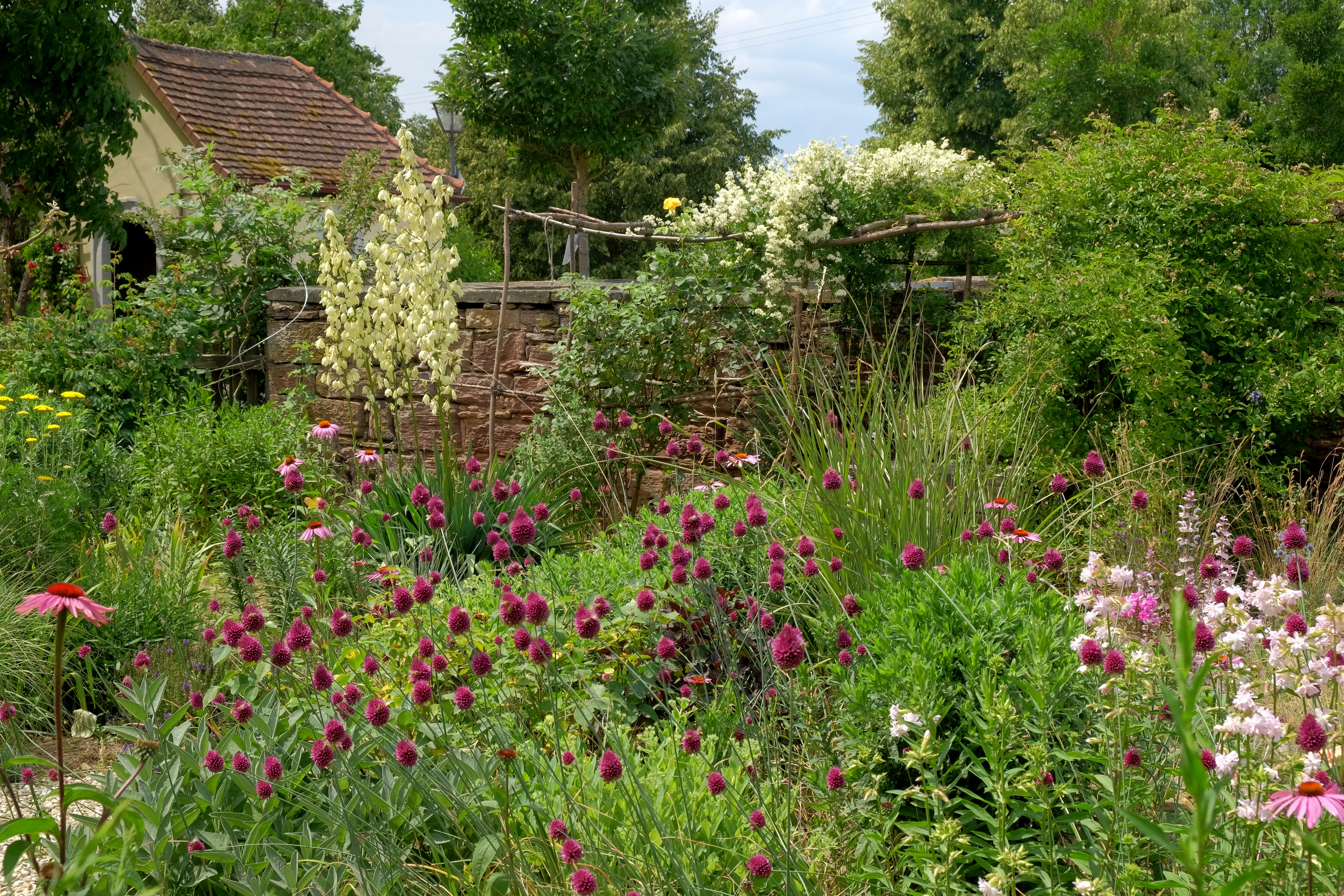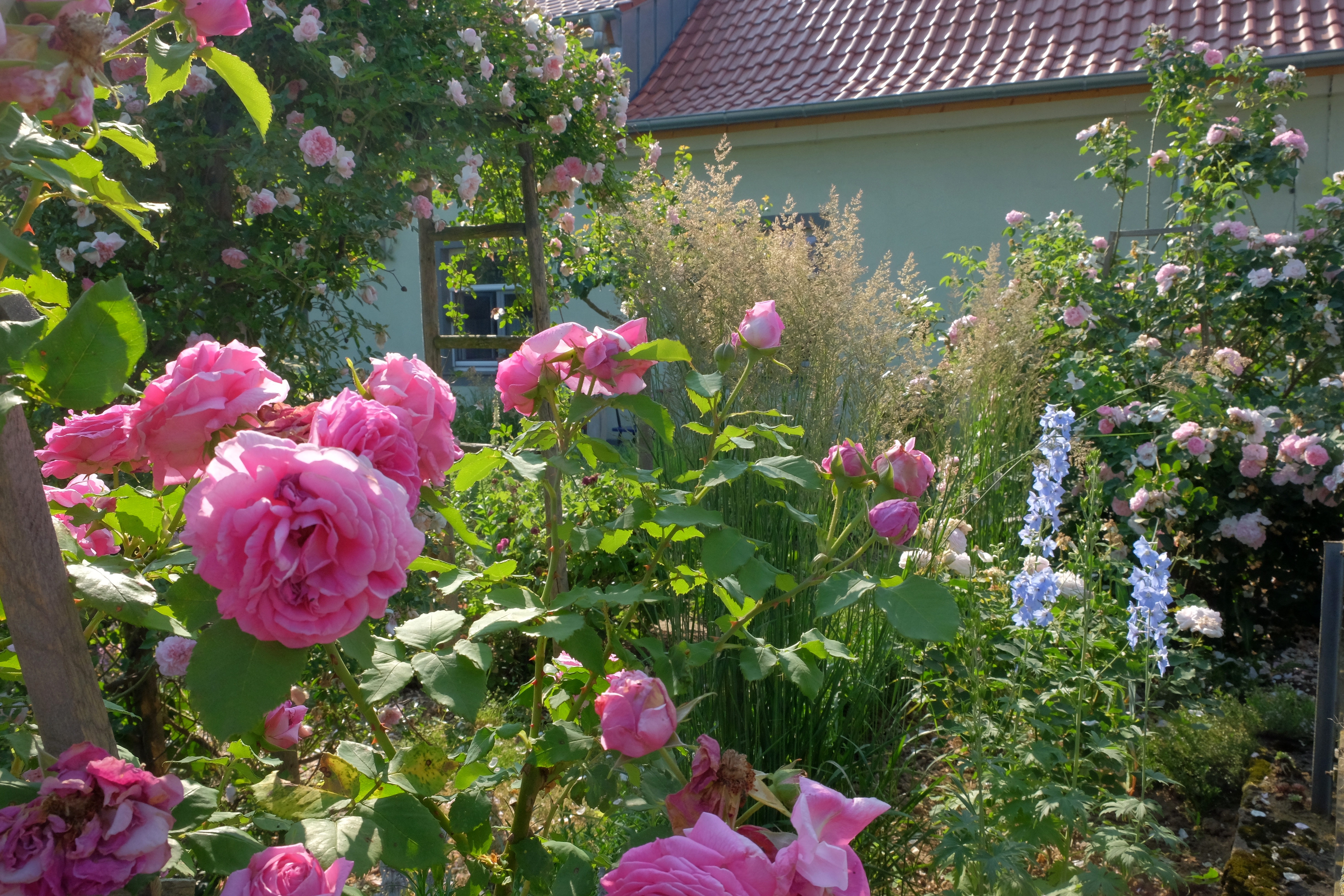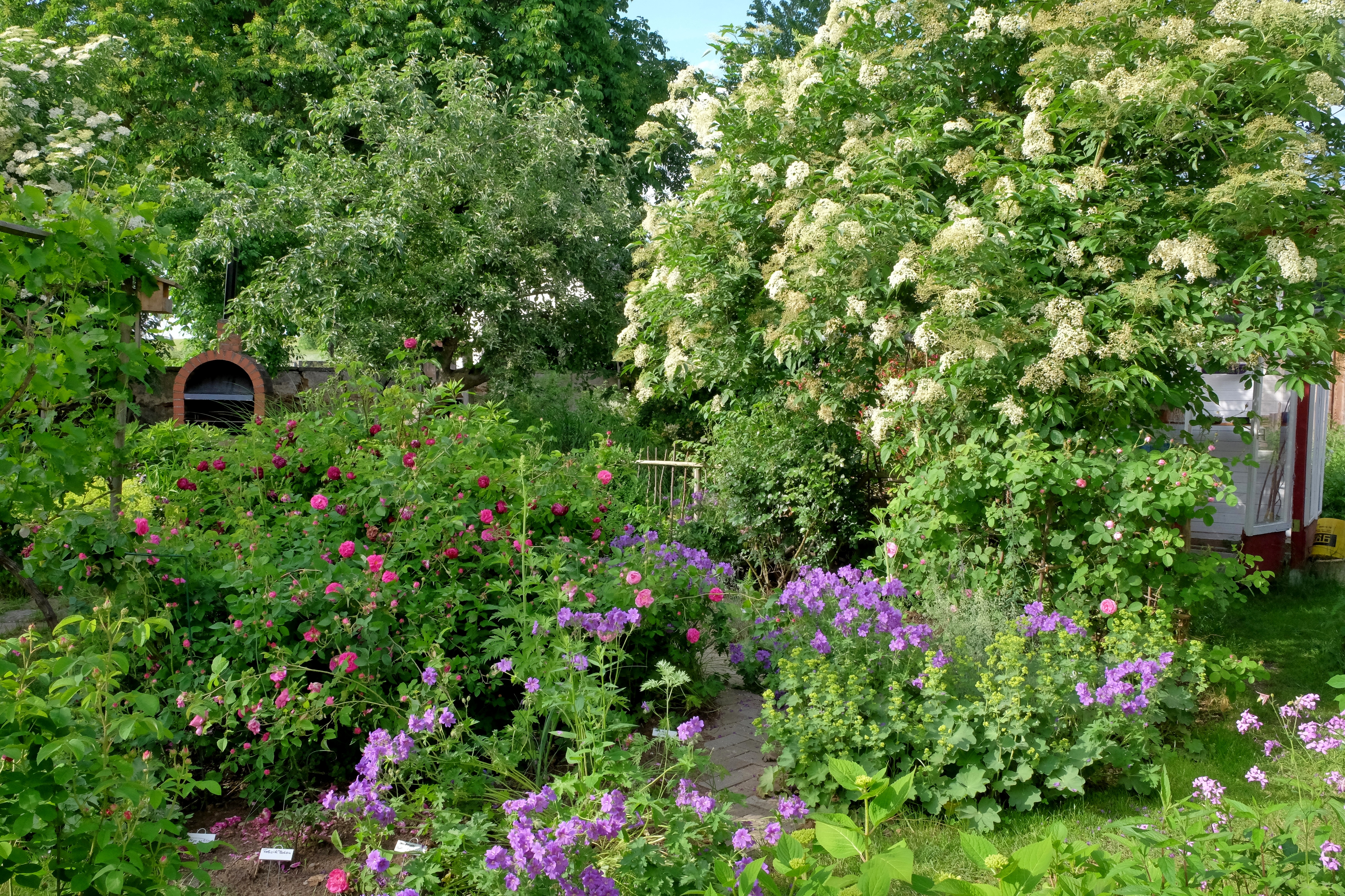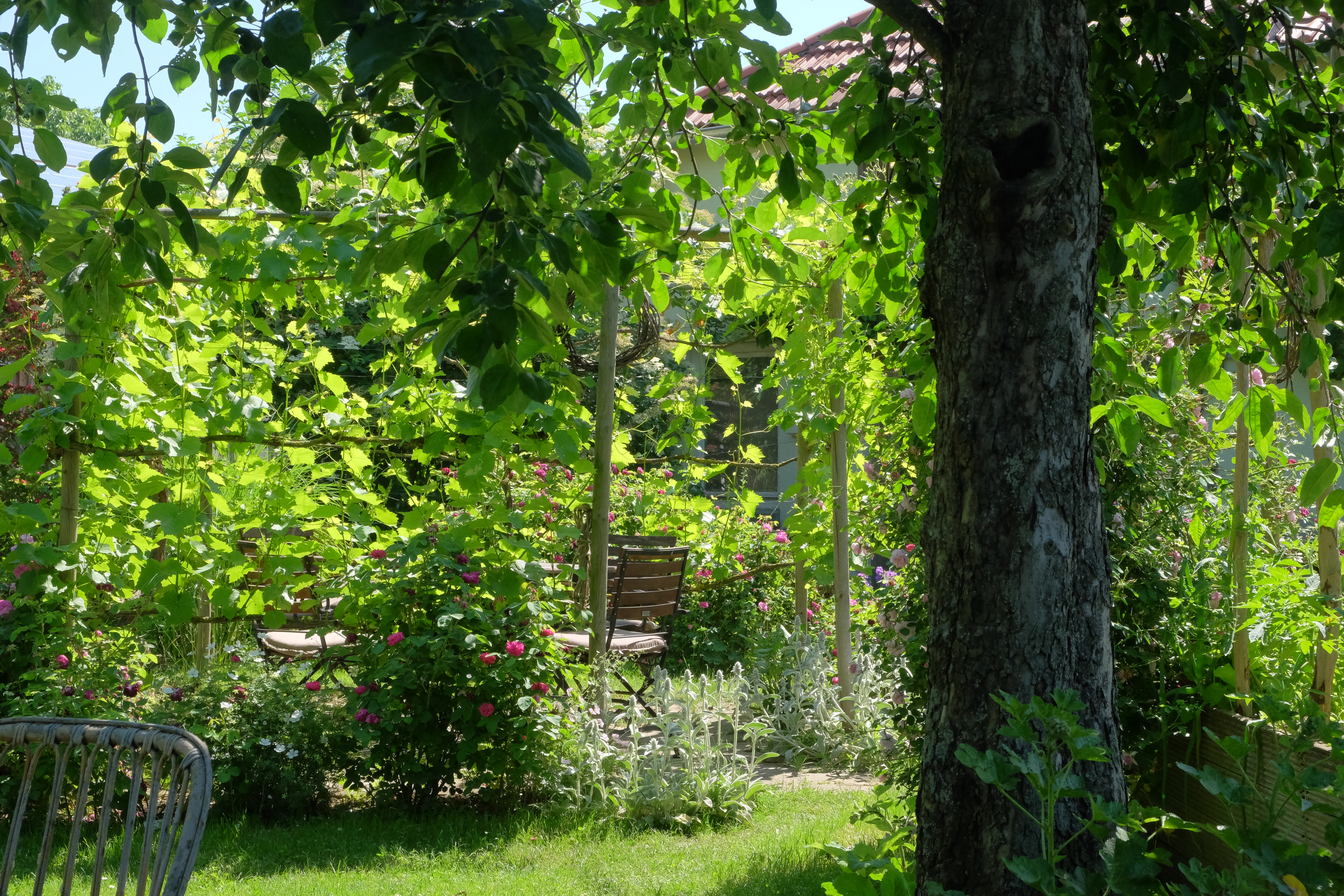 Schon immer galt der Garten in früherer Zeit als Arbeitsplatz und jeder Meter diente dem Anbau von Gemüse und Obst. Für uns war klar: nur keine Terrasse! Der Garten ist unser Wohnzimmer. Uns schwebte eine Weinlaube vor und so bauten wir aus Rundhölzern und gespanntem Draht ein Spalier, an dem die Rebstöcke im Cordon erzogen werden. Bereits Ende Juni ist die Laube komplett umrankt. Ringsherum pflanzten wir historische Rosen. Hinter der Laube rechts fanden weitere historische Rosen ihren Platz. Mit Rittersporn, Storchschnabel und Frauenmantel ein schöner Anblick.