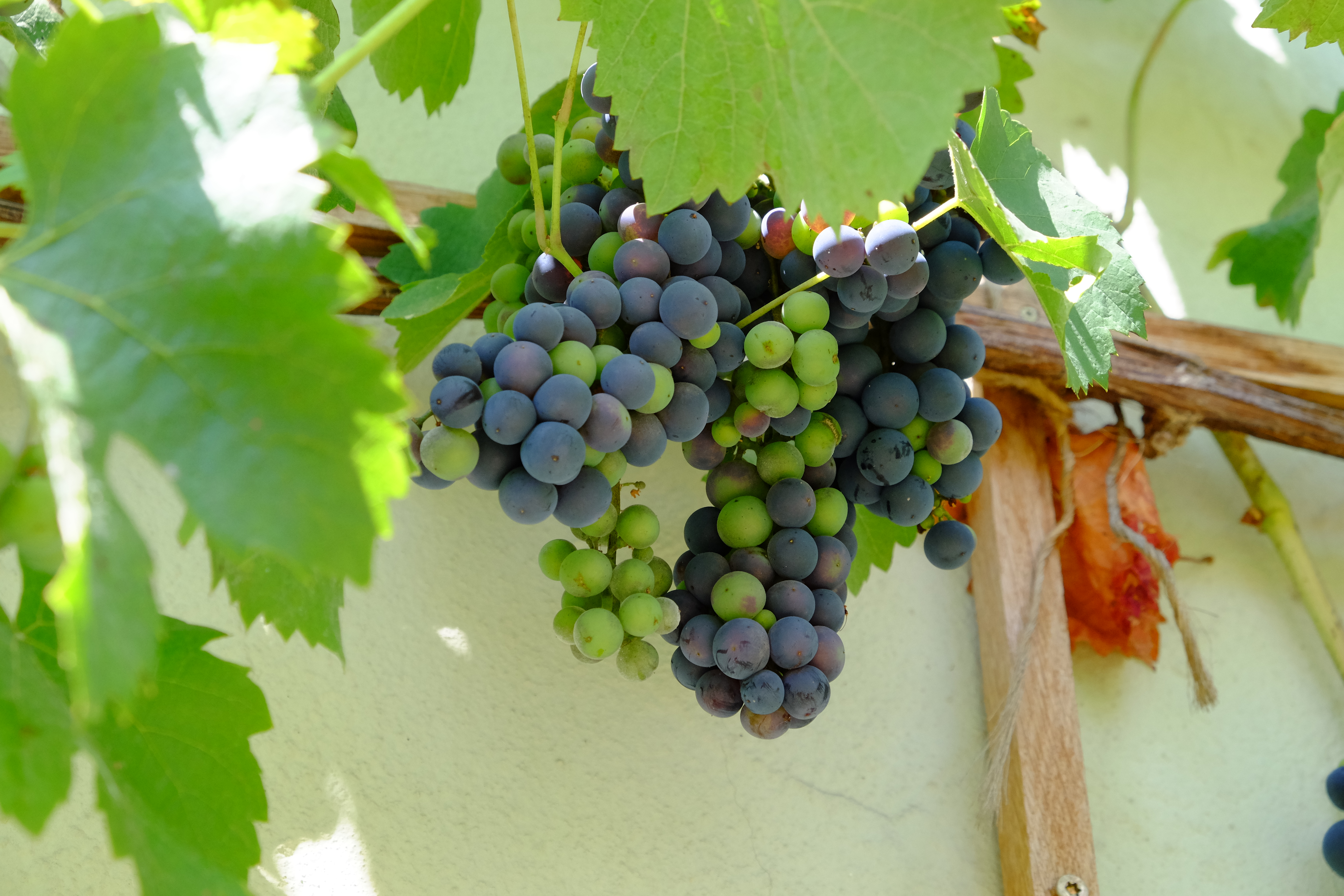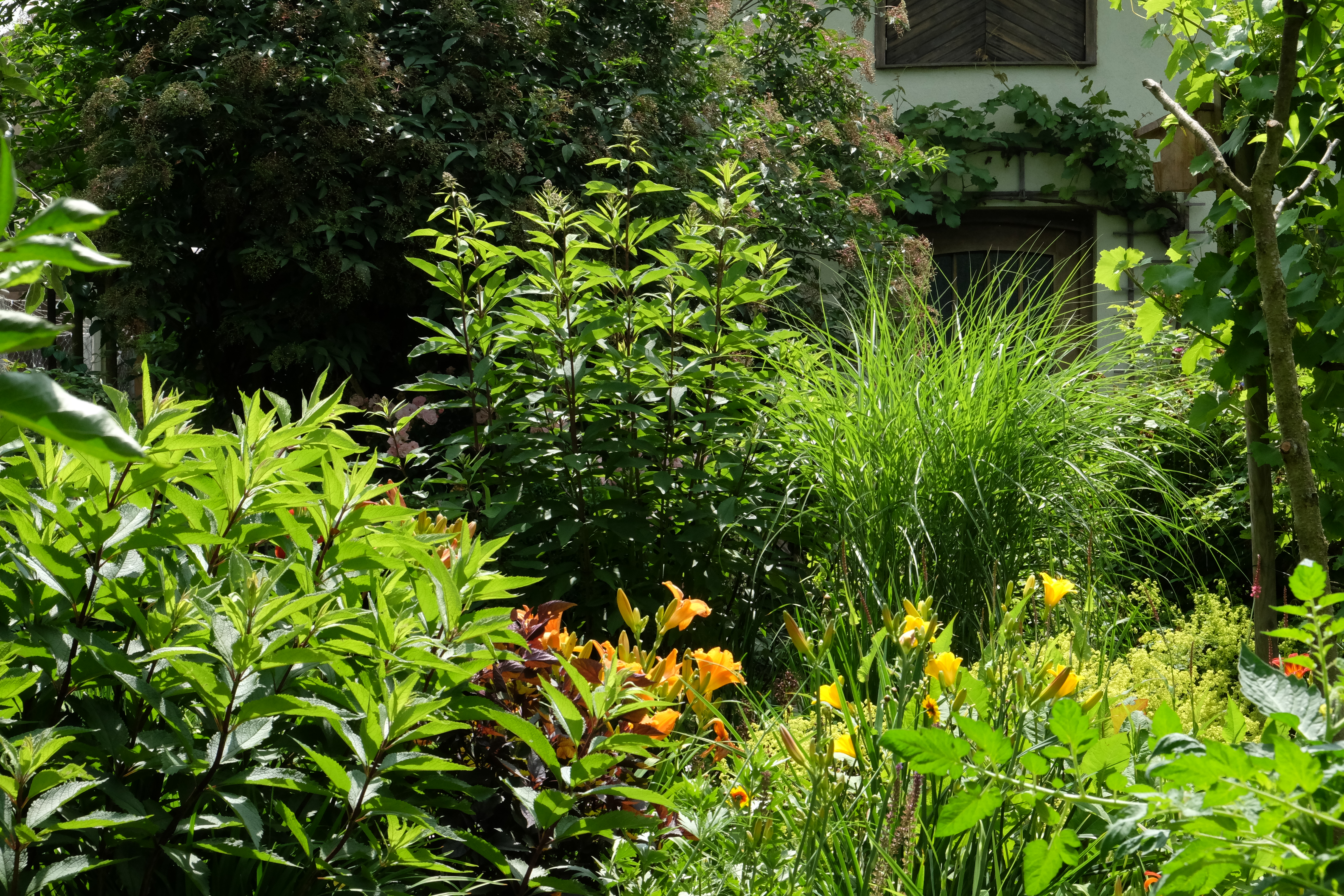 Die Hausfassade war in früherer Zeit mit Wein bewachsen. Der alte Rebstock trug immer noch. Wir spannten Drähte und lassen ihn seither Jahr für Jahr wie ein Laubendach am Carport wachsen. So bekamen wir ein kleines Schattenbeet. Dahlien sind sehr schön und man hat lange Freude mit ihnen. Das Ein- und wieder Auspflanzen der Knollen, das frostfreie Lagern und Trocknen stellte sich bei der Menge als zu aufwendig dar. So verschenkten wir sie und entschlossen uns, auch wegen der sommerlichen Hitze im Hof, zu einem „Duft- und Kräuterbeet“ mit mediterranen Halbsträuchern und Rosen. Der Untergrund besteht größtenteils aus Bauschutt. Zur Straße hin im Vorgarten wuchsen Rosen, Pfingstrosen, Buchs, Bergenie und Blaukissen. Etwas Sichtschutz gab es durch Weigelie, Forsythie und Hibiskus.