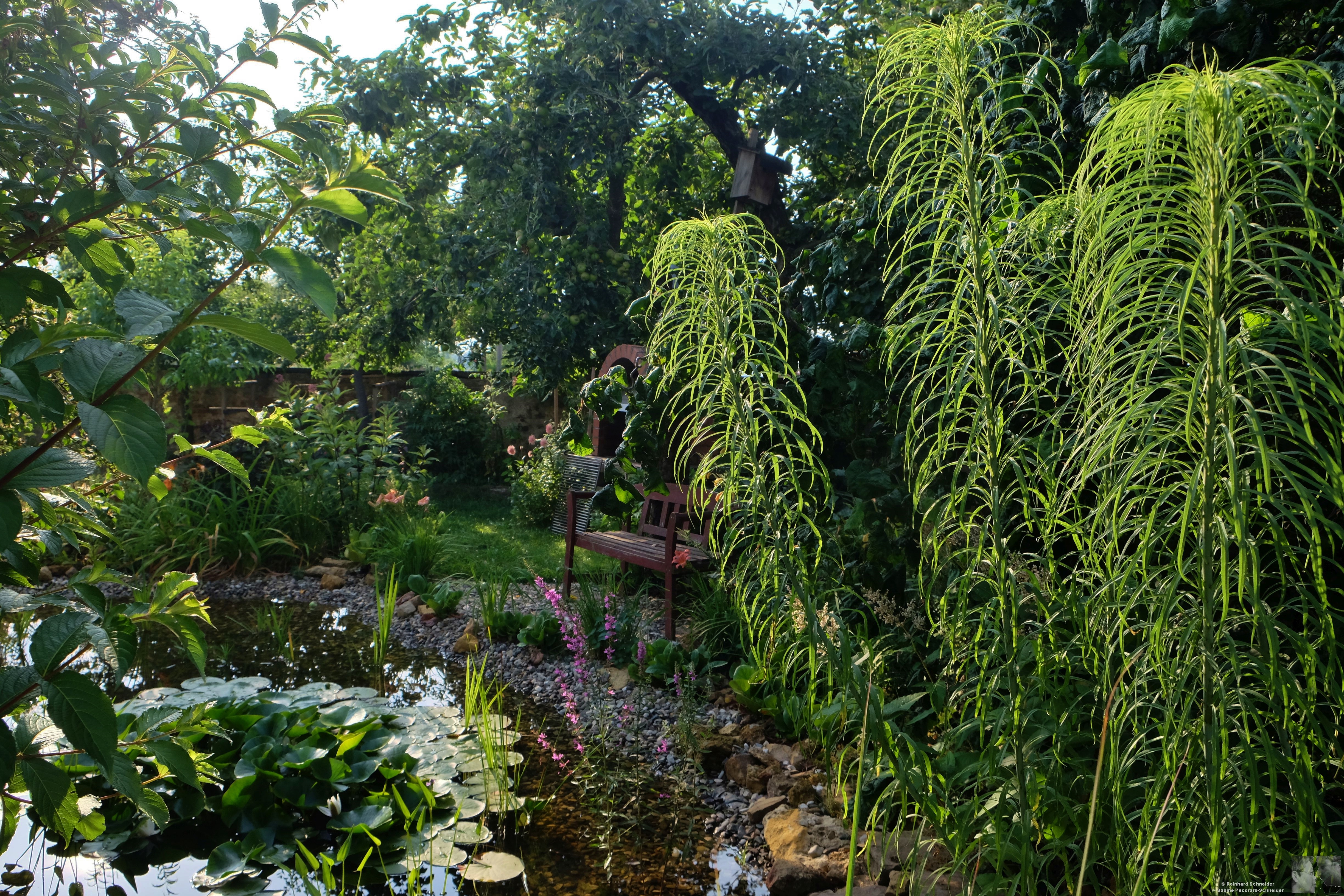 Im September 2015 besuchten wir zwei bekannte Gärten in Mecklenburg-Vorpommern. Der Wildstaudengarten von Jochen Wegner und der Gräser- und Teichgarten von Claus Gering hatten uns neugierig gemacht – mit neuen Ideen fuhren wir wieder zurück. Noch im Herbst begannen die Vorbereitungen, die Stauden wurden versetzt, die Seerose bekam ein Übergangsquartier einschließlich Libellenlarven und kleiner Molche. Ziel war die Vergrößerung, vor allem der Flachwasserzone. Im darauffolgenden Frühjahr waren die Pläne umgesetzt. Der Teich wird ausschließlich durch Regenwasser befüllt und so fällt im Sommer die Flachwasserzone leicht trocken, durch den Kies mit entsprechender Bepflanzung nicht störend. Dies ist auch die beliebte Tränke für Insekten und Freibad für die Vögel.