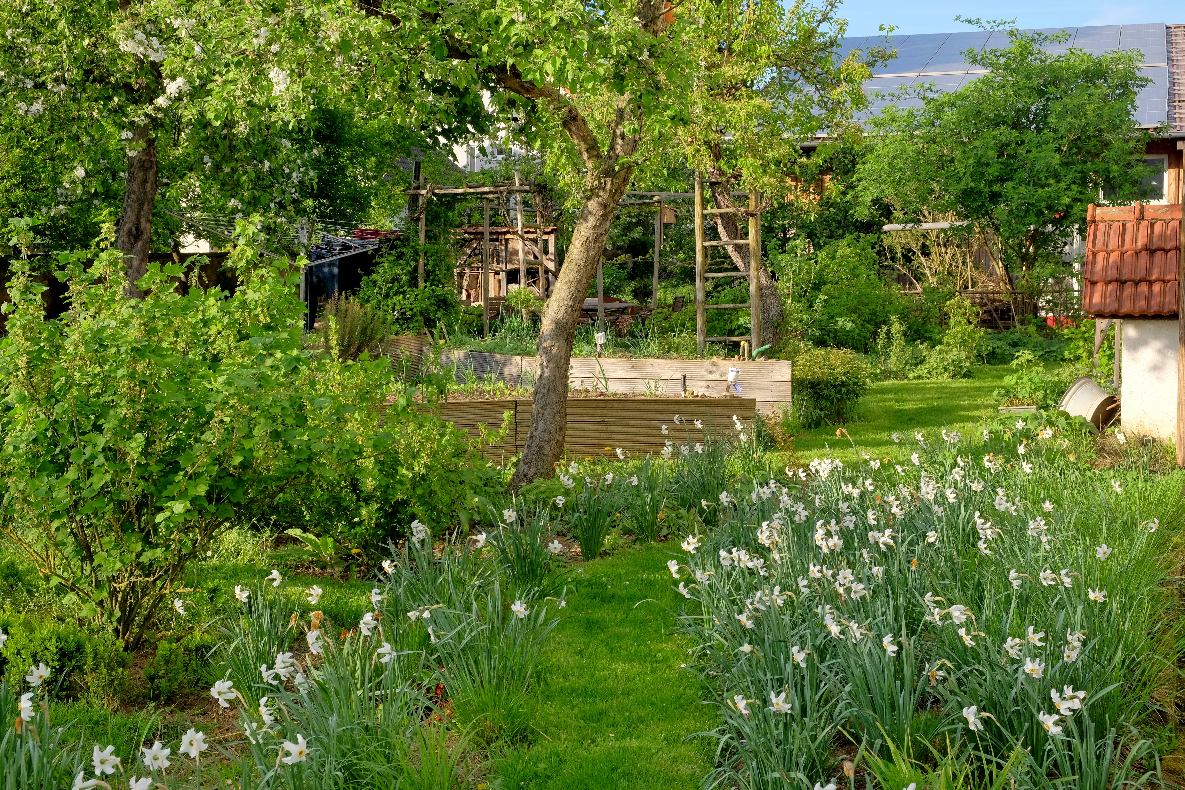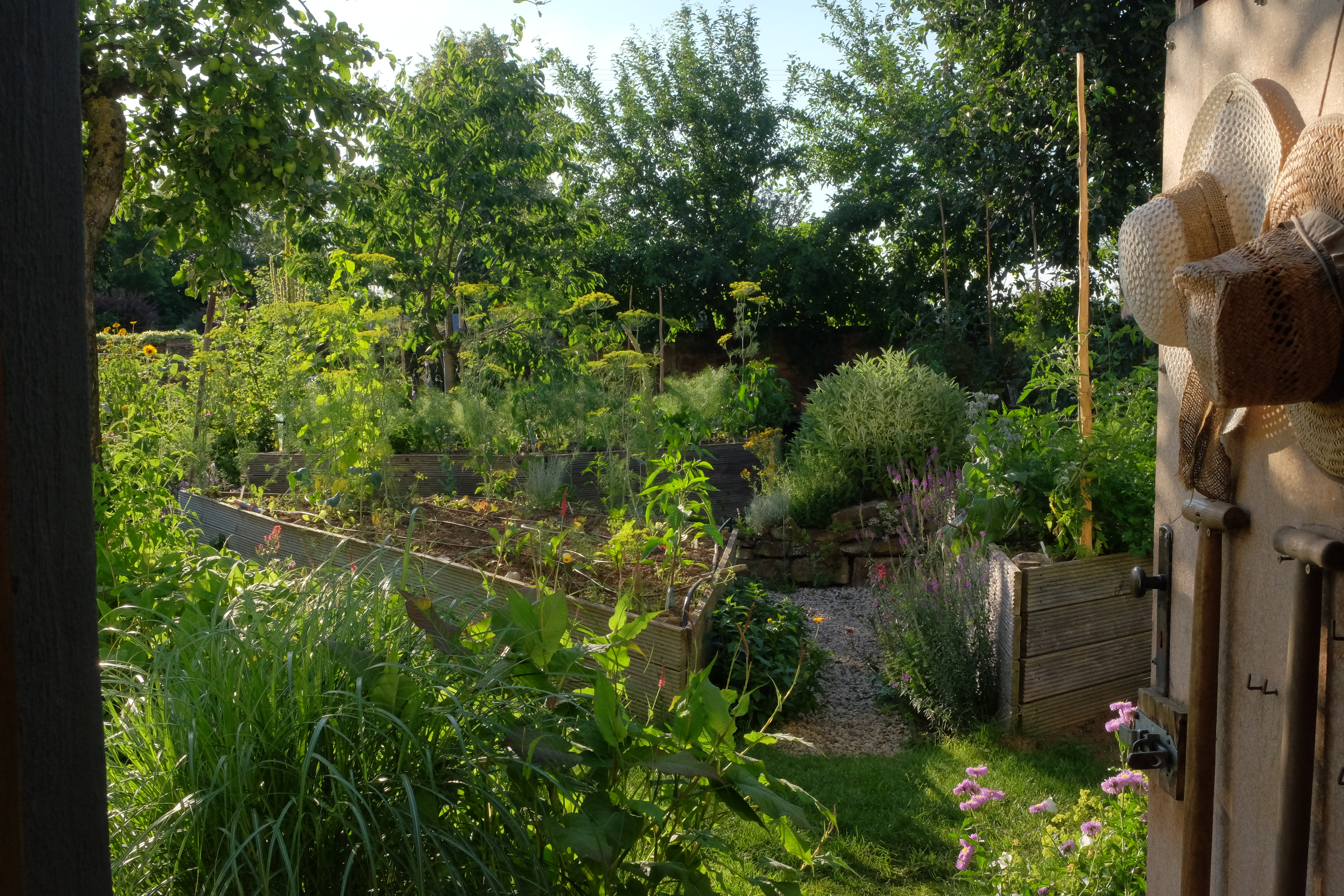 Nach vier Jahren waren aus Hügelbeeten vier Hochbeete entstanden. Damit können wir recht nah am Stamm, über den Wurzeln der Obstbäume, Gemüse pflanzen. Mit den Hochbeeten erreichen wir frühere und längere Ernten. Hier giessen wir regelmäßig und ausdauernd. Im Sommer 2018 wurde das Wasser im Brunnen knapp und so entschieden wir uns für eine Tropfbewässerung mit Regenwasser. Weitere Beete sind als Hügelbeete angelegt, die nach Süden ausgerichtet sind. Die Obstbäume sind mit trockenheitsverträglichen Stauden wie z. B. Bergenien und Geranium macrorrhizum unterpflanzt, am Gehölzrand auch mit Päonien.