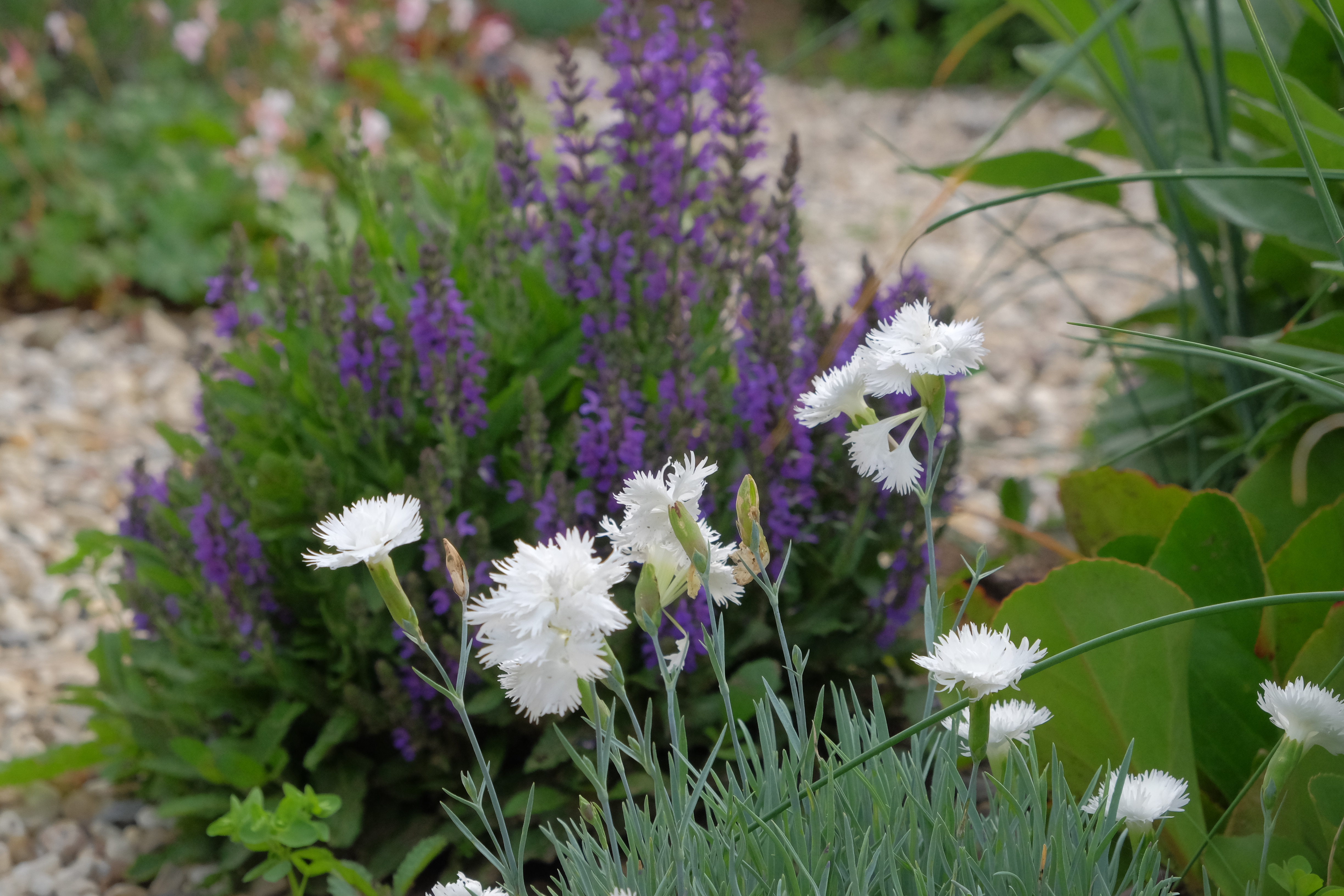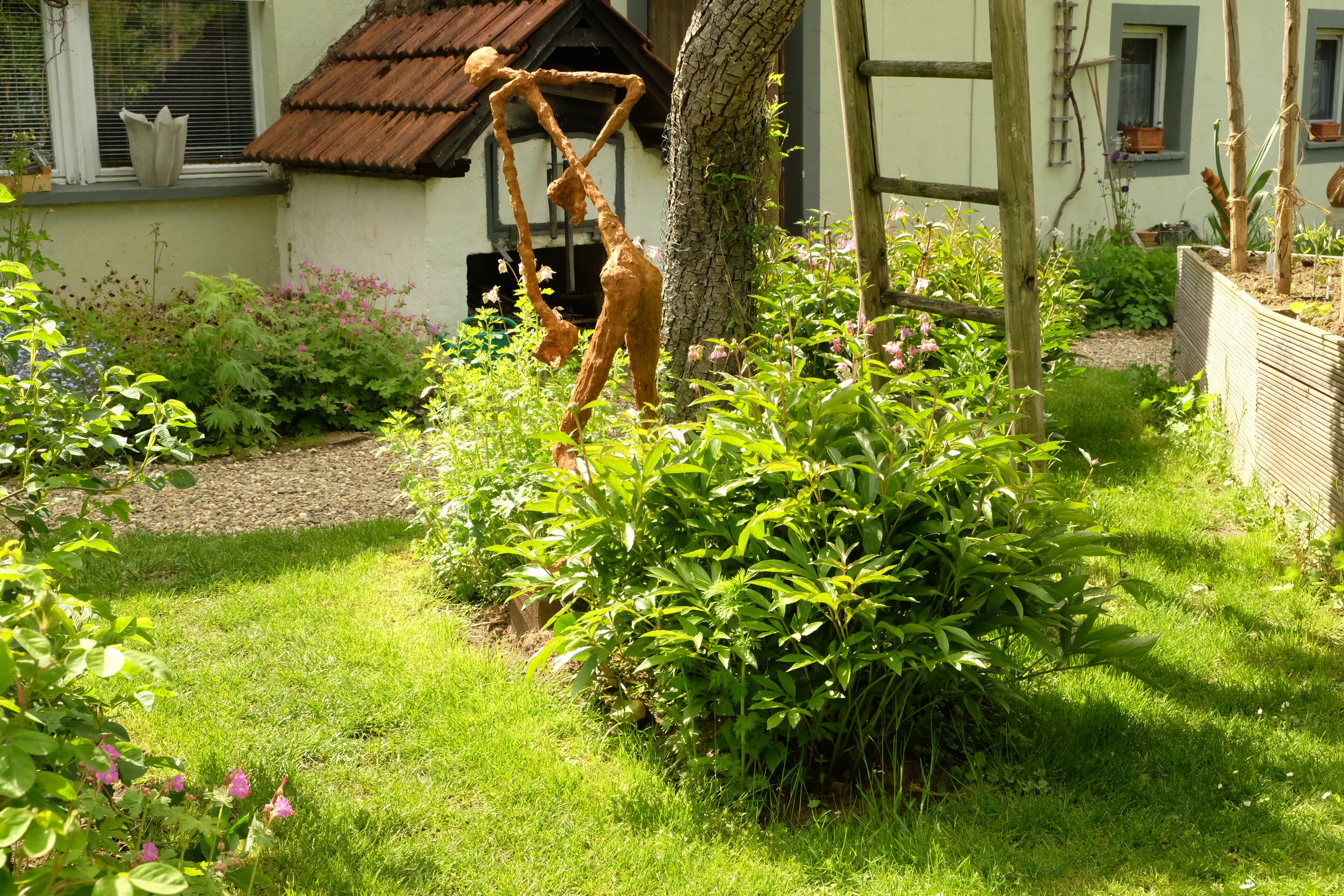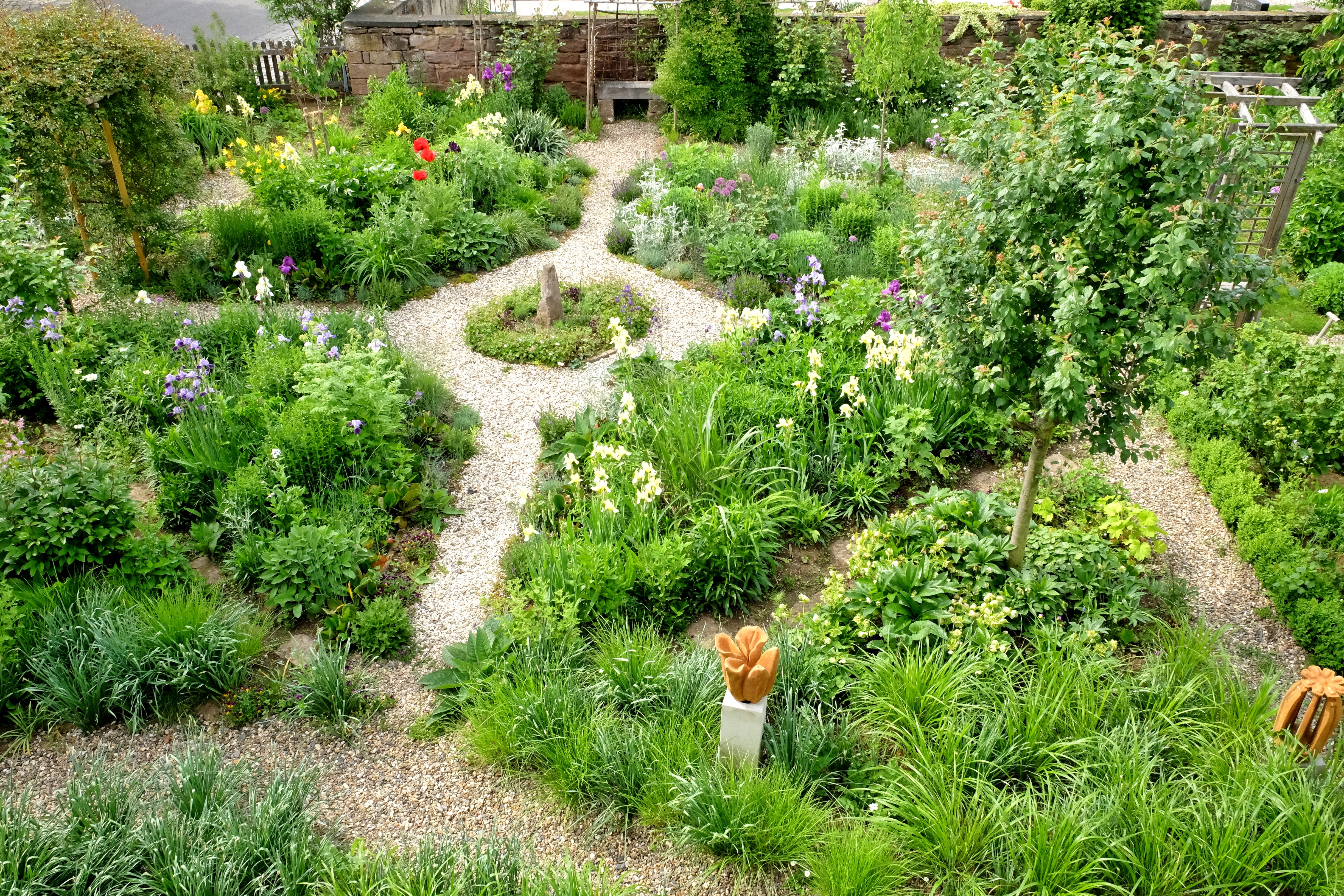 Die Wegekreuze und die Sichtachse, die Staudengarten, Nutzgarten und Freisitz verbindet, sind bereits aus Kies. Für ein harmonisches Bild haben wir im Winter 2018/2019 nun auch noch die im Sommer ständig ausgetrockneten Graswege durch Kies ersetzt. Wir ergänzen überall die Pflanzlücken, wie wir es in Karina Waltzers Berglegarten in Freiburg gesehen haben, damit der Boden nicht austrocknet. Die Auswahl ist unendlich groß und dafür lassen wir uns Zeit. „Erlaubt ist, was gefällt“ ist nicht unsere Devise, sondern standortgerechte Pflanzung. Die Erfahrungen aus dem Sommer 2018 waren wichtig. Die Stauden haben sich bewährt. Unser Boden ist durchlässig, so dass wir die Winternässe nicht fürchten. Die Hortensien, die am meisten gelitten haben, bekommen noch eine Chance. Sollte es in diesem Jahr ähnlich werden, werden sie durch geeignete Stauden oder Gehölze ersetzt. So ändert sich der Garten Jahr für Jahr.