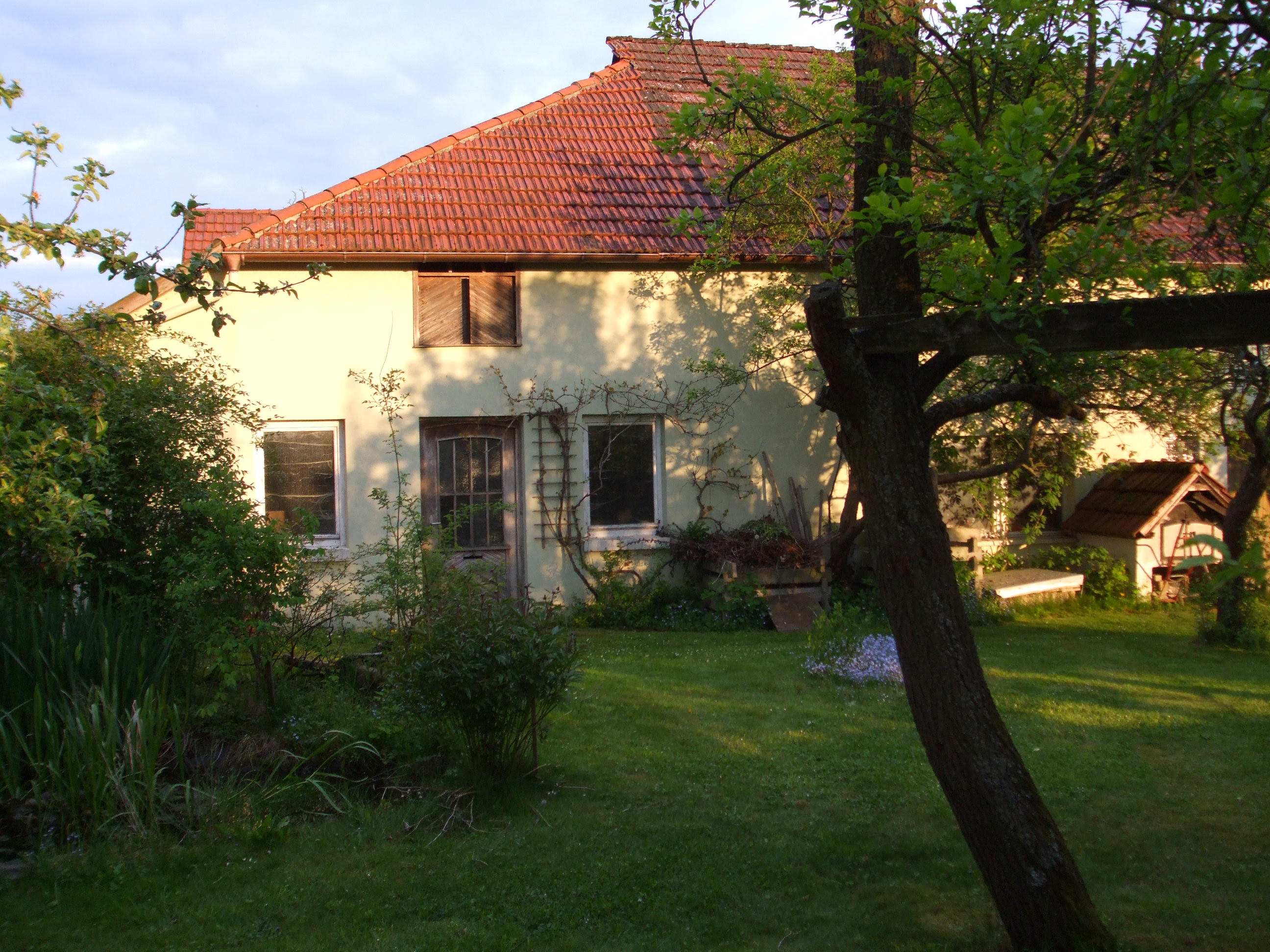 Die Aussicht, von einer Mietwohnung mit Gartennutzung in ein altes Anwesen von 1898 mit 1100 qm Grundstück zu wechseln, ließ alle Bedenken vergessen, die man mit über 50 normalerweise hat. Die Planung des Gartens hatte schon begonnen, als der Kauf des Anwesens noch in den Sternen stand. Schon länger träumten wir von eigenem Gemüse und Obst, von einem Staudengarten, einer Obstwiese und einer Werkstatt oder einem Atelier. Mit unserer Utopie vor Augen und der Energie, die daraus erwächst, war es nicht so wichtig zu wissen, welche Arbeit vor uns liegen würde.