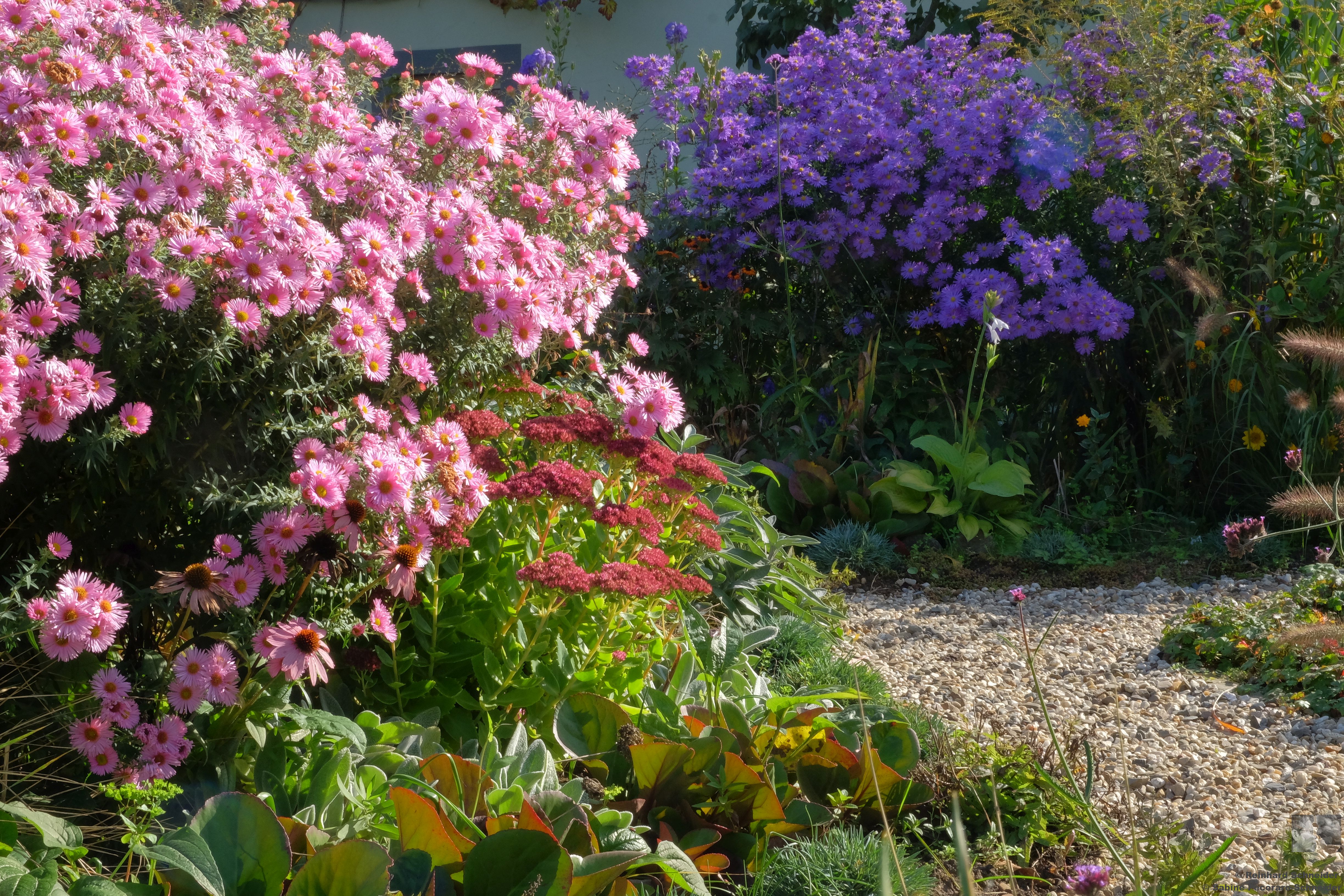 Seit unserem Umzug haben wir immer wieder über fremde Gartenzäune geschaut: was hier gut wächst, haben wir gepflanzt. Gegossen werden nur Neupflanzungen. Es hat sich durchaus bewährt, diese im Spätsommer oder Herbst vorzunehmen. Unsere große Liebe aber gehört den Astern, über 40 verschiedene haben wir im Garten.Vor etwa zwei Jahren haben wir angefangen, die Bäume zu unterpflanzen. Es sind bislang noch Testpflanzungen. Was sich bewährt und gefällt, wird umgesetzt.