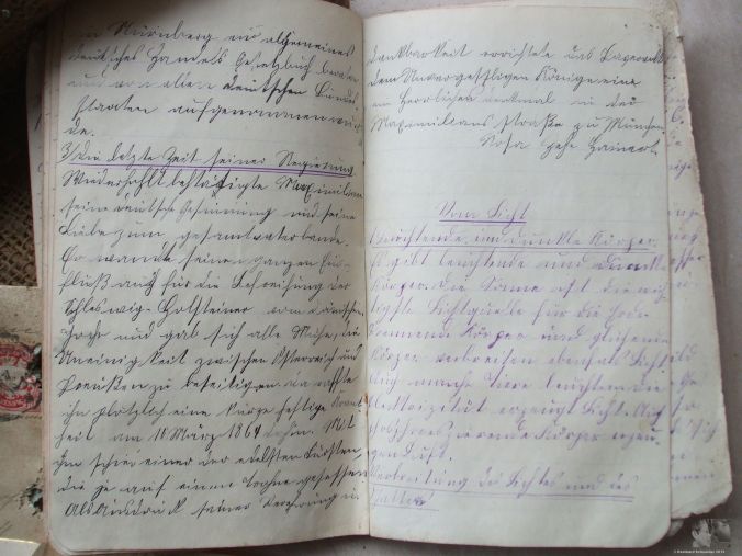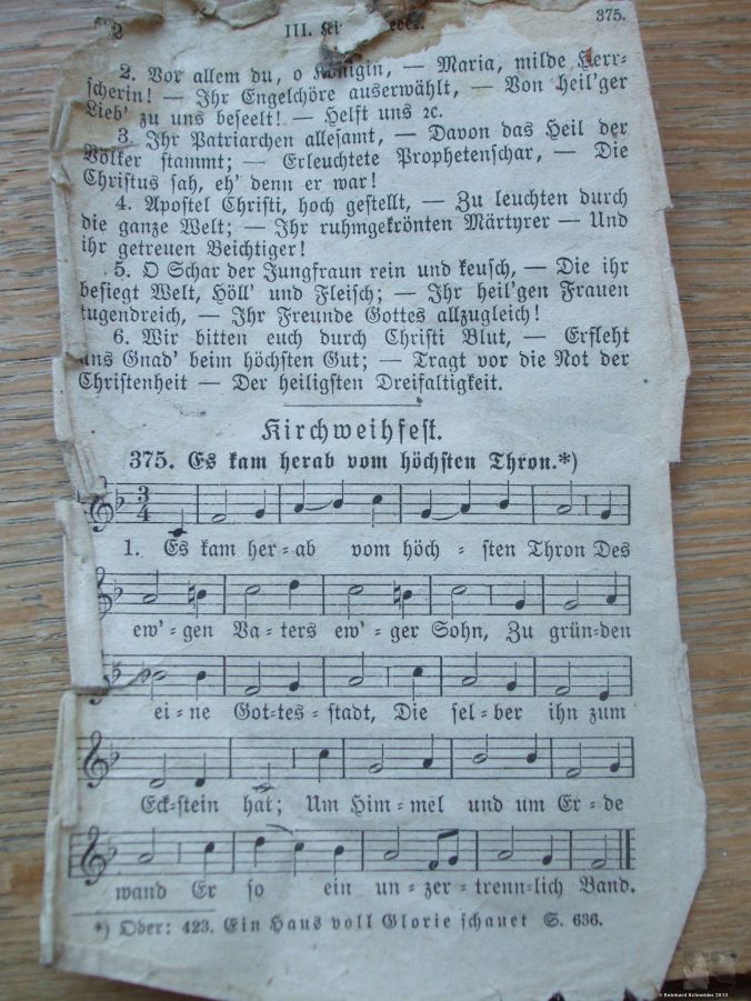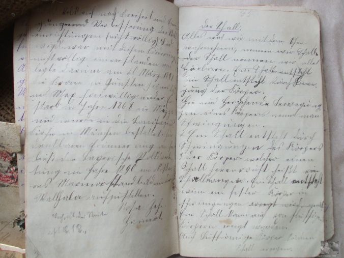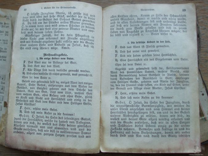 Auf dem Spitzboden, halb versteckt, lag ein Leinen-Säckchen. Hierin befanden sich handschriftliche Texte und ein Gesangbuch für die private Andacht, sowie ein Lese – bzw. Schulbuch der 20er Jahre des letzten Jahrhunderts.